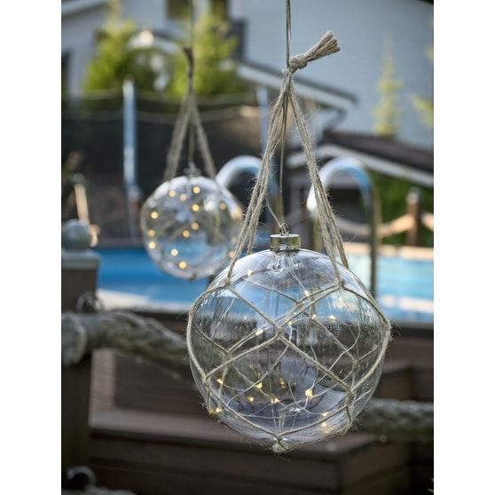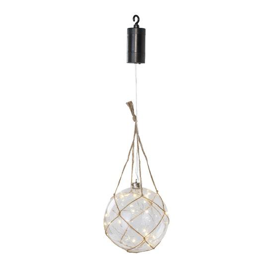 Ulossijoitettavalla paristokotelolla varustettu, merihenkinen led-koristepallo köysinarusomistein. 15 lämpimän valkoista lediä, ei vaihdettavia. Sisältää 4 x AA-paristot. Materiaali muovi ja naru. Kirkas johto. Sisältää on/off-kytkimen ja 6 tunnin ajastimen. Pallon halkaisija 15 cm ja narun korkeus 80 cm.