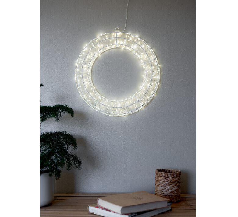 Metallikranssi, jonka 480 lämpimän valkoista lediä luovat upean loisteen. Kranssin runko on taustaltaan tasainen, joten se pysyy tukevasti seinää, ikkunaa tai ovea vasten. Etupuolelta runko on hieman kupera. Metallirungon ympärille on kieputtu valolankaa. Rakenne tekee kokonaisuudesta erittäin näyttävän ja silti kevyen! Kranssin halkaisija on 38 cm, syvyys 4 cm. Kranssi soveltuu myös ulkokäyttöön.