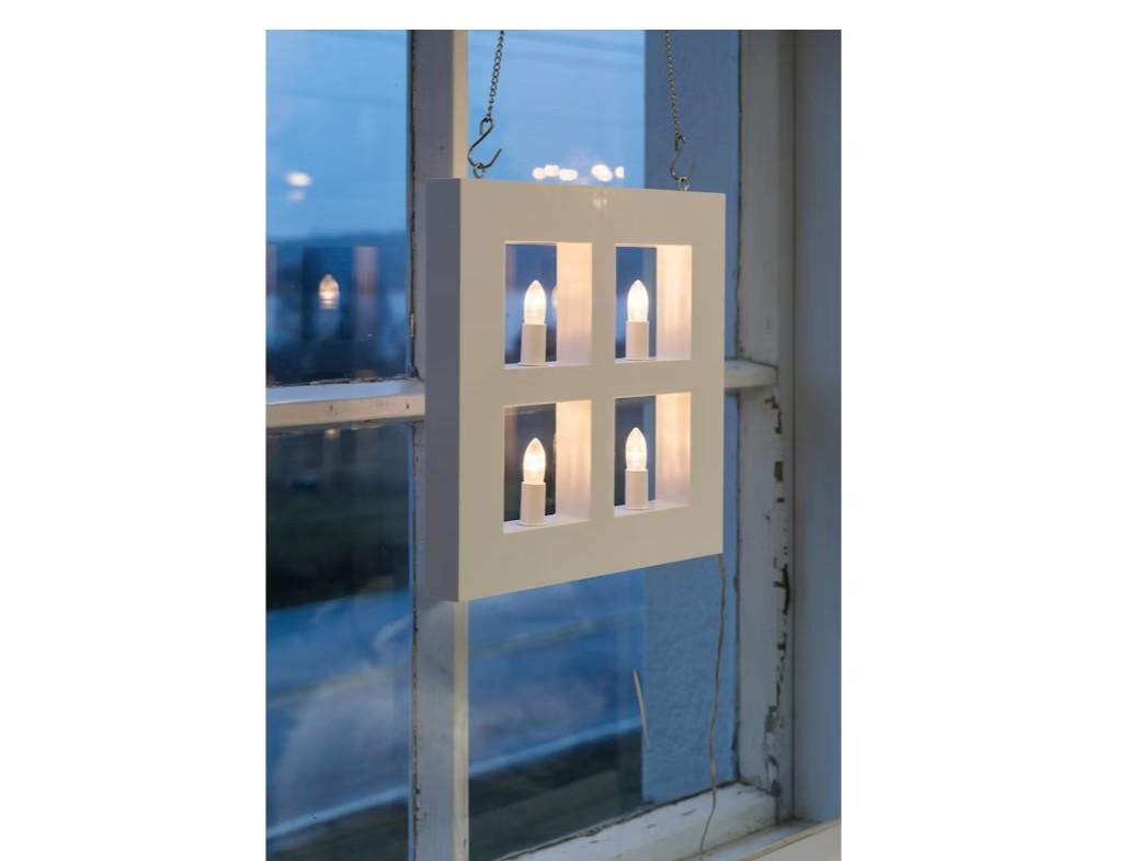 Kynttilät 4 kpl kukin omassa ruudussaan. 2 kpl ripustusketjuja. Led lämmin keltainen, ei vaihdettava, rinnankytketty. Materiaali muovi. Johto kirkas. Muuntaja 4,5V 1,35W IP20.