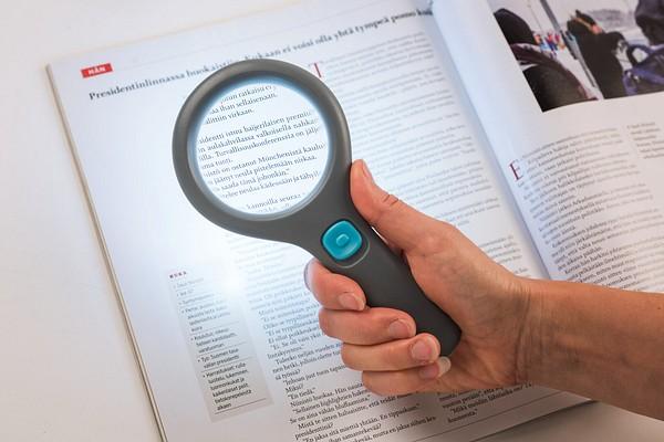 Led-valoilla varustettu suurennuslasi on heikkonäköisen oiva apu! Helppo käyttää: on/off-kytkin suurennuslasin varressa. Myös paristokotelo on suurennuslasin varressa. Lasin kehyksessä kolme led-valoa, suurennuslasissa kolminkertainen suurennus.