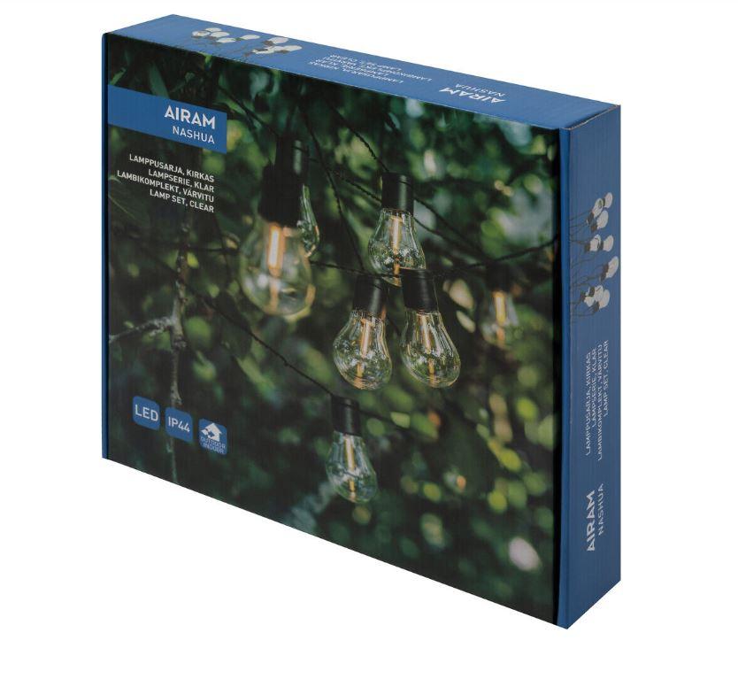 Nashua lamppusarja soveltuu sisä- ja ulkokäyttöön. Lamppujen sisältä näkyvä filamentti luo kokonaisuudesta kevyen ja raikkaan. Monikäyttöisellä lamppusarjalla piristät sekä arkea että juhlaa. Lamppukuvuissa kaksi eri sävyvaihtoehtoa. Led lämmin valkoinen, ei vaihdettava. Johto tumma.