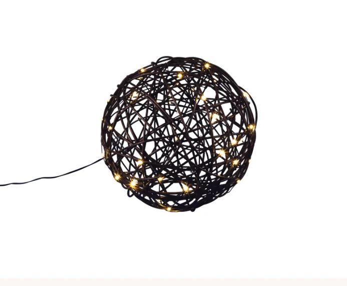 Valokoriste, jonka voi asettaa sellaisenaan tason päälle tai ripustaa johdosta roikkumaan. Musta metallirunko, jonka ympärille on taivuteltu ruskeaa polyrottinkia. Lämpimän valkoista valoa loistava led-sarja kieputettu rungon ympärille. Kaunis yksittäin ja upea usean koristeen ryhmässä!