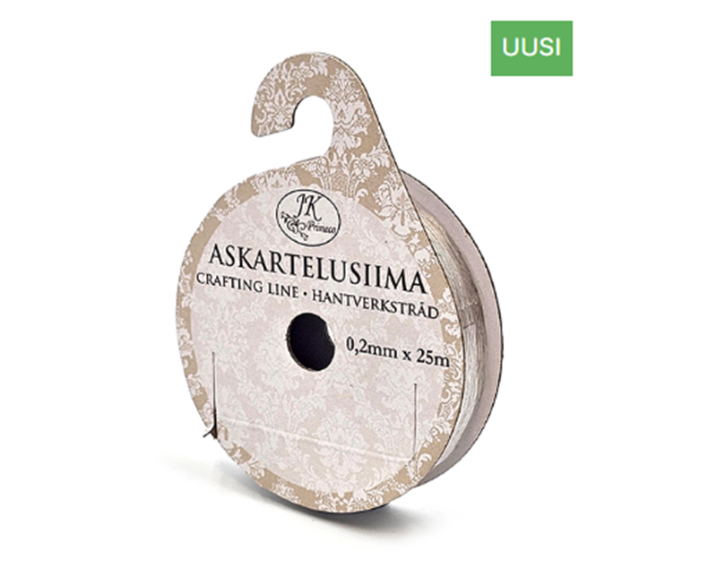 Askartelusiima askarteluun ja korujen valmistamiseen. Pakkaus sisältää 25 metriä joustamatonta kirkasta siimaa, jonka paksuus on n. 0,2mm.