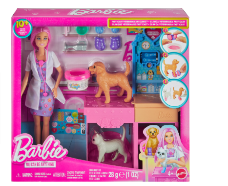 Barbien eläinlääkäriasemalla hoidat eläimet kuntoon ammattitaidolla. Hoida ja tutki eläimiä tutkimuspöydällä, muotoile massasta sopiva kipsi ja tassu paranee hetkessä. Sisältää eläinlääkärinuken, tutkimuspöydän, kissan, koiran ja 15 tarviketta. 3+