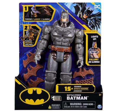 Luo omia Batman-seikkailujasi DC Comicsin Battle Strike Batmanilla. Tässä 30 cm:n toimintahahmossa on täysi haarniska, realistinen muotoilu, sarjakuvamaisia yksityiskohtia ja vempaimia, jotka herättävät suosikki-Batman-hahmosi eloon. Batarangin, verkon ja koukun avulla Batman voi kohdata kaikki vihollisensa. Aseta viisi tarviketta Batmanin käsiin, vedä hänen jalkansa taakse ja heitä ne superroistoja kohti. Ja kun Batmanilla on tyhjät kädet, hän voi myös laukaista iskun. Laukaise kaikki tarvikkeet oikeilla käsivoimin taistellaksesi rikollisuutta vastaan ja suojellaksesi Gotham Cityä. Paina Batmanin rintaa aktivoidaksesi yli 20 erilaista ääntä. Kaikenikäiset Batman- ja DC-fanit rakastavat Batman-toimintahahmoja, jotka herättävät mielikuvituksen luomaan eeppisiä supersankaritehtäviä. Valmistaudu toimintaan Battle Strike Batman -toimintahahmon kanssa.