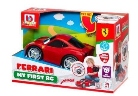 Upea ensimmäinen kauko-ohjattava auto perheen pienimmille hurjastelijoille. Ratin muotoisessa ohjaimessa on eteen- ja taaksepäin painikkeet, liiketunnistin vasemmalle ja oikealle ohjaamiseen ja aidon tuntuinen äänitorvipainike. Autossa on myös toimivat etu- ja takavalot. Ajon kruunaa aidot Ferrarin moottoriäänet. Taajuus 27MHz. Paristot: ohjain: 3 x AAA (sisältyy), auto 3 x AA (ei sisälly). Ikäsuositus 24kk+.