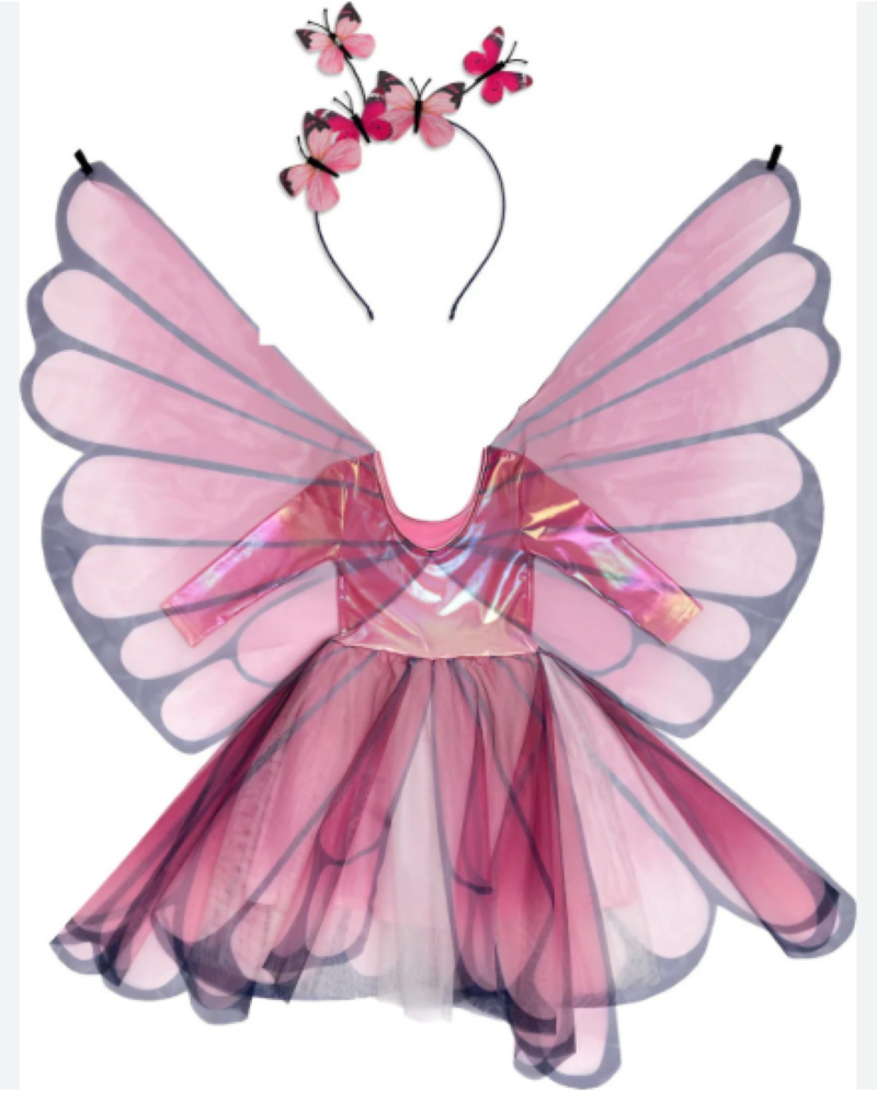 Mutta mikä todella erottaa tämän mekon muista, ovat siihen kiinnitetyt perhosen siivet. Kauniisti painetusta verkosta valmistetuissa siivissä on sormilenkit, jotka räpyttelevät ja läpsyttelevät jokaisella liikkeellä. Ne lisäävät lapsesi päivään ripauksen taikaa ja ihmeellisyyttä. Olipa kyseessä sitten puutarhassa liitävä perhonen tai taivaalla liitävä keiju, nämä siivet vievät heidät varmasti mielikuvituksen ja seikkailujen maailmaan. Täydennä asu yhteensopivalla perhospannalla!