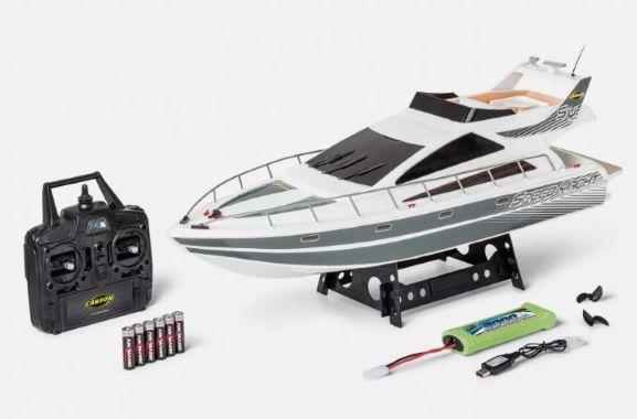 Erikoisluokan pikavene!CARSON Speed -jahti on tyylikäs pikavene oikealla teholla. Kuten Ocean Queen (tuotenumero 500108044), sitä käyttää kaksi tehokasta 550-tyyppistä harjattua moottoria – yksi molemmille laivan ruuveille. Jopa 30 km/h huippunopeus on mahdollista! Speed Yacht eroaa sisar-aluksestaan erittäin tasaisella ja tuulta leikkaavalla rakenteella. Speed Yacht on käyttövalmis heti ajoakun latauksen jälkeen. 2,4 GHz:n kauko-ohjainjärjestelmän, joka sisältää lähettimen akut ja NiMH-akun laturilla, lisäksi toimitukseen kuuluu myös kaksi laivan vararuuvia. Tehokas 2000 mAh ladattava akku takaa 20 minuutin ajoajan. Aseta kurssi – ja seikkailusi voi alkaa! Osta – Shop – toimintaa!