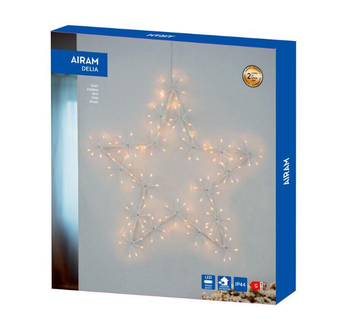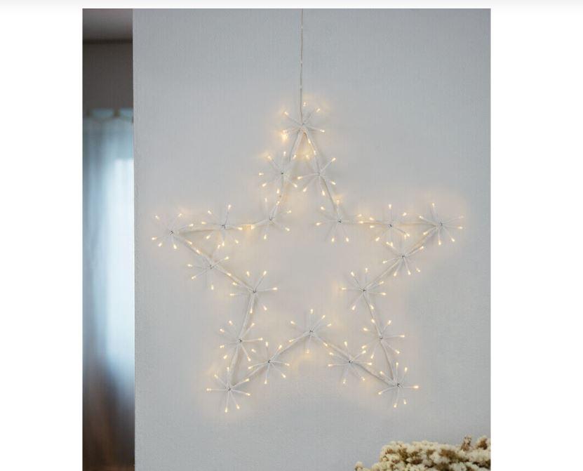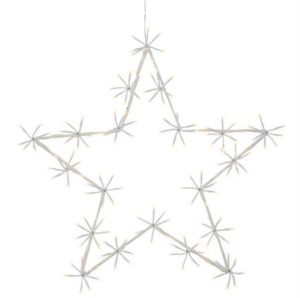 Todella upea ja paljon valoa antava tähtikoriste. Soveltuu myös ulkokäyttöön. Valkoinen metallirunko (Ø 60 cm), jossa useita seitsemän ledin nippuja, yhteensä 140 lämpimän valkoista lediä! Jokaisen led-nipun voi taivuttaa haluamaansa muotoon erikseen. Muuntaja 24 V 3,6 W IP44. Johto kirkas. Liitosjohdon pituus 3 m.