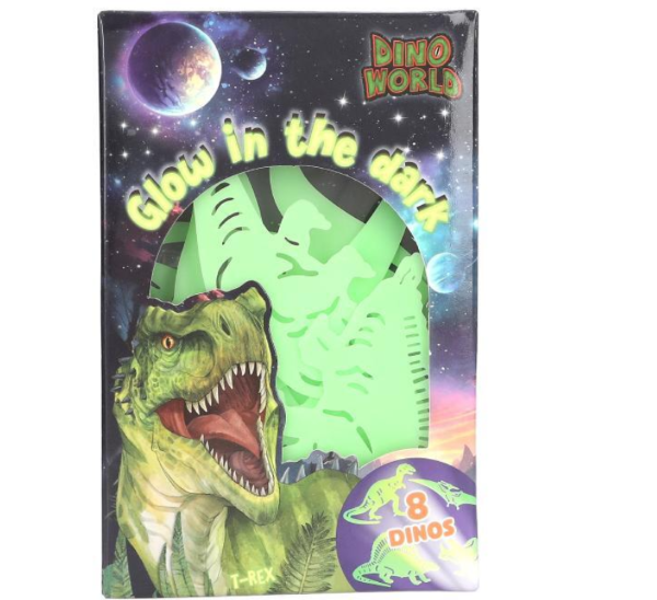 Setti koristetarroja, jotka hohtavat pimeässä, kun ne ovat altistuneet valolle. Tarrat kiinnittyvät kaksipuolisella teipillä sileille pinnoille, esimerkiksi seinään tai kattoon. Setti sisältää dinosauruksen muotoisia tarroja 8 eri mallissa, kuten t-rex, triceratops ja pterosaurus.