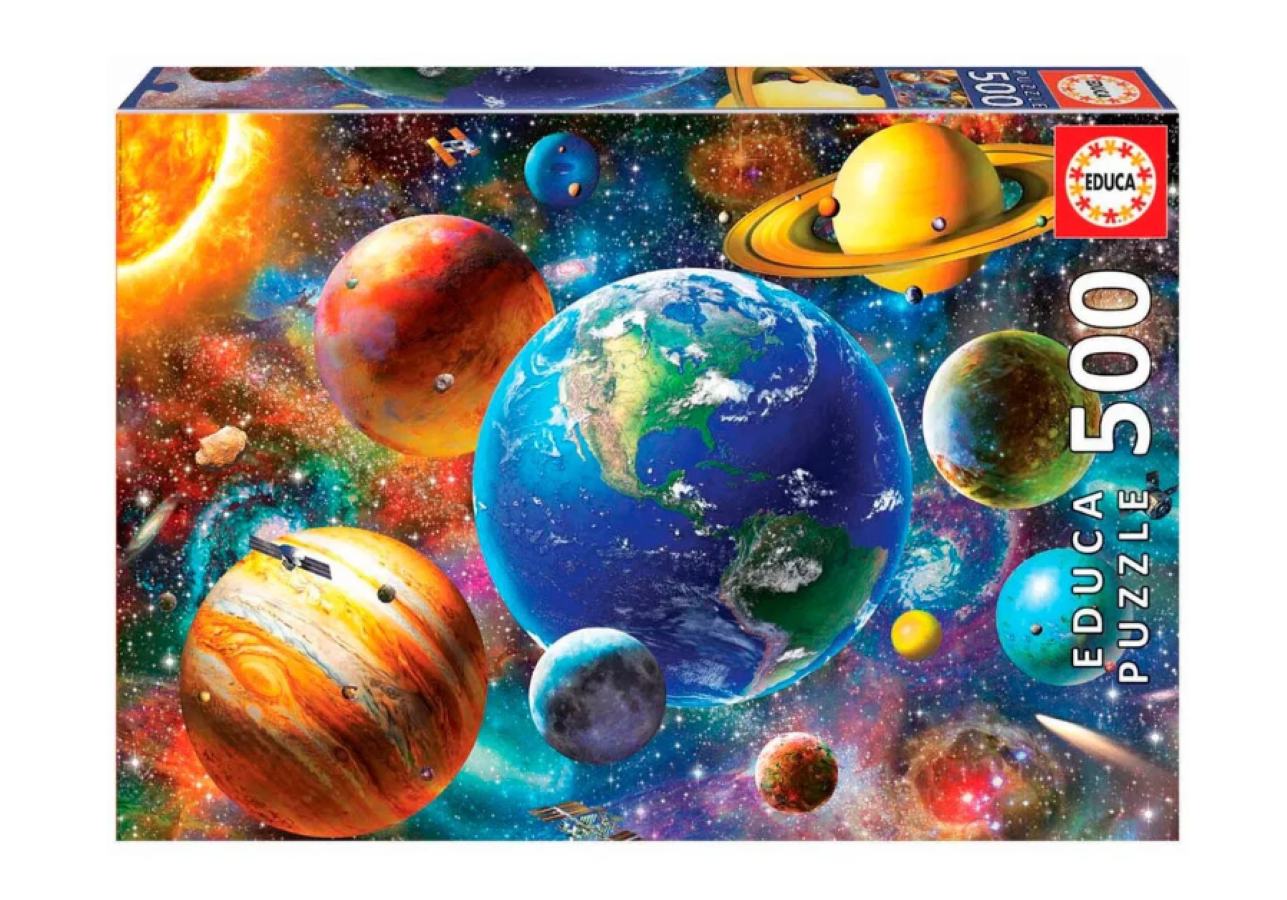 Palapeli, jossa kuvana aurinkokunta. Palapelissä on 500 palaa. Kootun palapelin koko: 48×34 cm. 12+