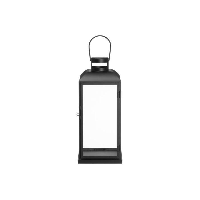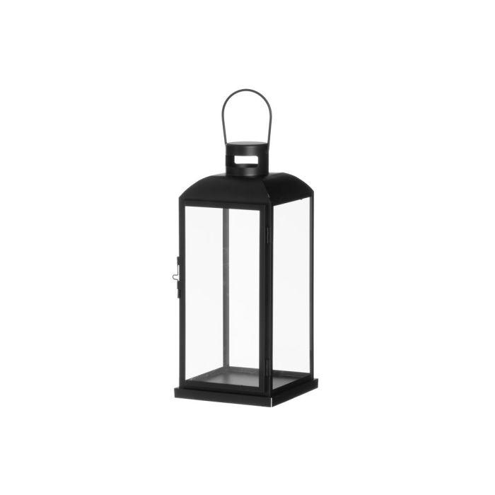 Musta metallilyhty, kirkkaat lasipaneelit. Korkeus 40 cm. Soveltuu kynttilöille, LED-kynttilöille ja paristokäyttöisille koristevaloille. Materiaali: rauta, lasi. Mitat: 17,5 x 17,5 x 40 cm