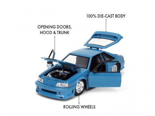 Jada Toys Fast and Furious -malliauto 1989 Ford Mustang GT (sininen) – Elokuva-auto Fast & Furious 10:stä avattavilla osilla, mittakaava 1:24 (19 cm), 8-vuotiaille ja sitä vanhemmille faneille ja keräilijöille