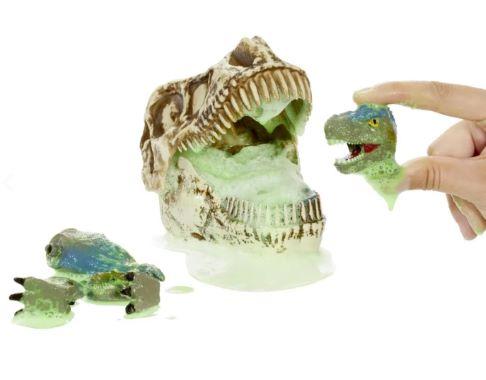 Lisää kalloon vettä ja katso kun se vaahtoaa! Avaa leuat ja kokoa sisältä paljastuvista osista dinosaurus ja purista sitä! Dino joko sylkee, räkii tai kakkii limaa!