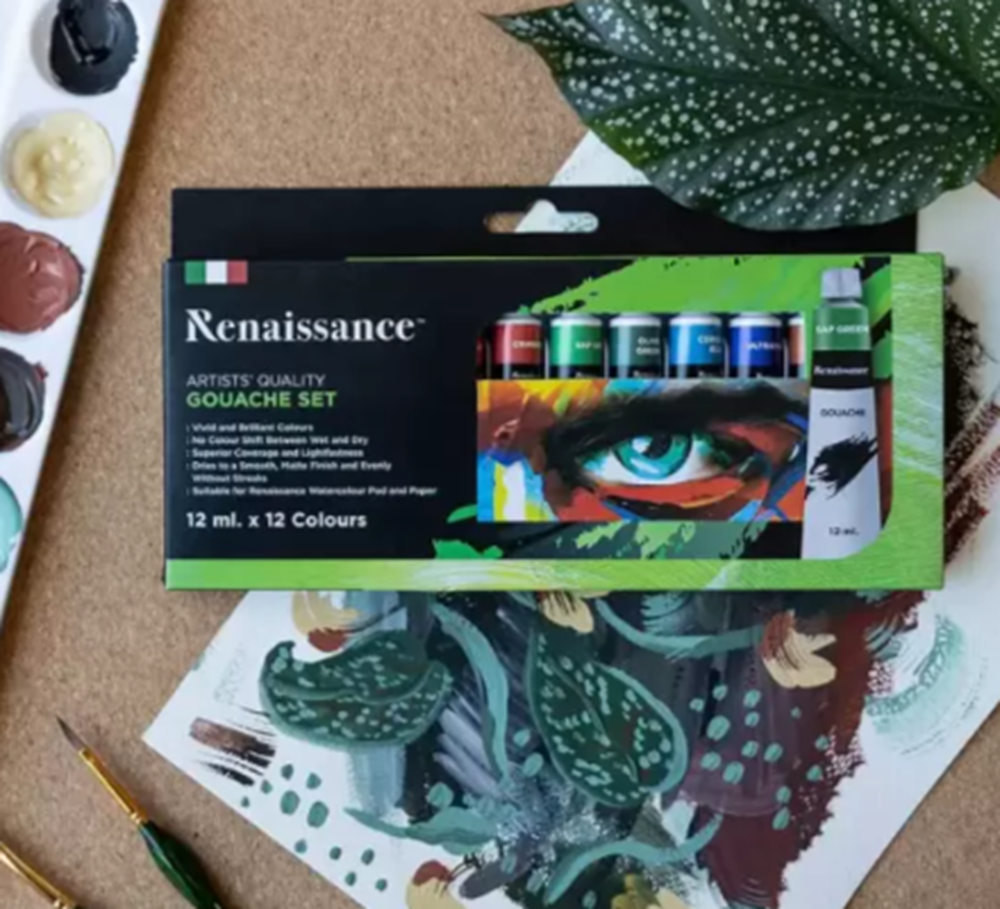 Renaissance guassivärit ovat vesiohenteiset, pigmentti on vahva ja värit toistuvat kirkkaina. Guassivärien lopputulos on peittävä ja mattapintainen.