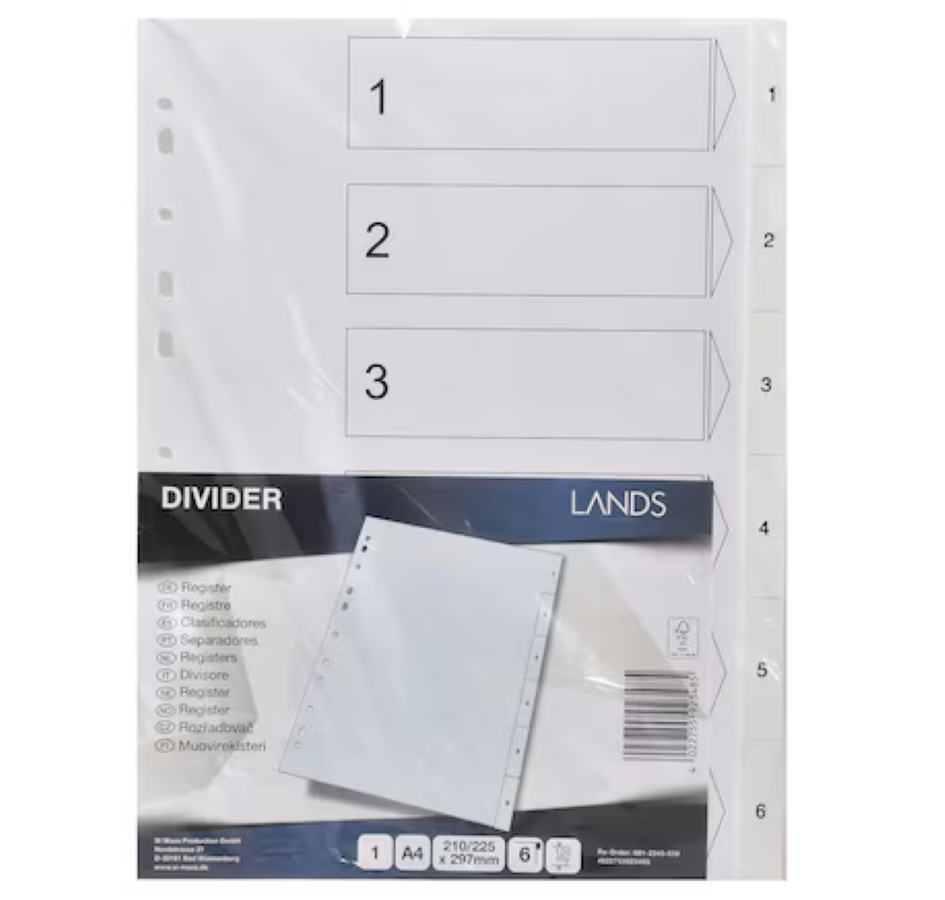 Näissä jakajissa on numero välilehdet, ja ne tarjoavat järjestelmällisen lähestymistavan paperityön luokitteluun, jotta siihen pääsee nopeasti käsiksi. Tämä tuote sopii A4 kokoisille dokumenteille. Käytettävissä on yhteensä 6 välilehteä. Valkoisten välilehtien hillitty ulkonäkö tarjoaa hienostuneen mutta käytännöllisen lisän asiakirjojen organisoimiseen, mikä tehostaa niiden selaamista.