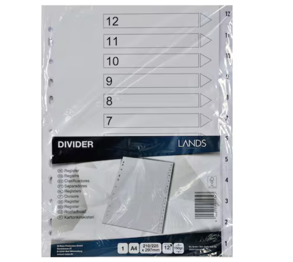Numerojakajat helpottaa asiakirjojen lajittelua ja löytämistä tehokkaasti. Nämä hakemistot ovat tarkoitettu erityisesti A4 asiakirjoille. Jakaja koostuu 12 välilehdestä, joten se on ihanteellisen kokoinen useimpiin tarpeisiin. Nämä Valkoiset välilehdet tuovat hienovaraisen mutta tehokkaan visuaalisen lisän asiakirjojen järjestämiseen, mikä helpottaa navigointia.