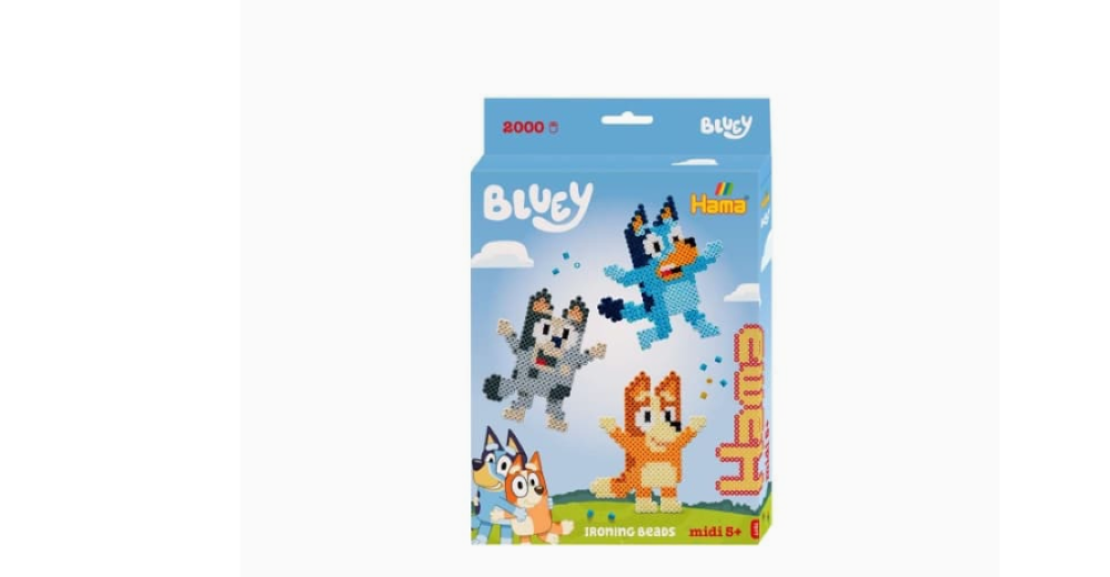 Hama Bluey pakkaus sisältää noin 2 000 silityshelmeä, iso kirkas alusta (234TR), mallikuvia, ohjeet, ja silityspaperia. Ikäsuositus 5+.