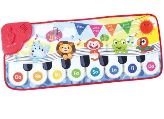 Interaktiivinen pianomatto. Matossa on 8 pianokosketinta ja 5 eläinääni painiketta, joita lapsi voi soittaa jaloilla.