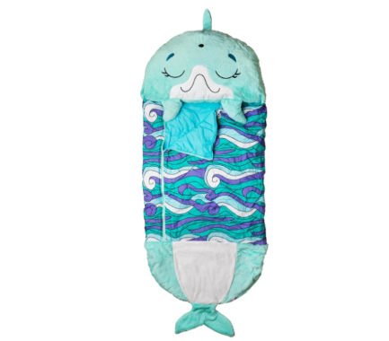 Suloinen ja samettisen pehmeä M-kokoinen delfiini-eläinpehmotyyny, joka avautuu 167 cm pituiseksi makuupussiksi. Lempeän turkoosi-valkoisen, pyöreän tyynyn päällä on veikeät delfiinin kasvot, ja siihen on ommeltu myös kaikki sen evät ja pyrstö. M-koon makuupussi sopii n. 5-vuotiaalle tai sitä vanhemmalle lapselle, ja sen koko on n. 63 x 63 cm. Pehmotyynyksi, päiväunille, yökyläreissuille, telttaan!