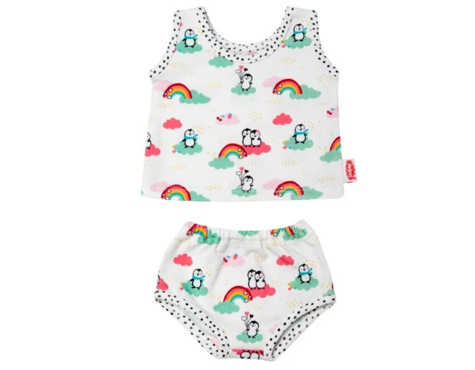 2-osaisen alusvaatesetti on mitä loistavin perustuote nuken vaatekaappiin! Kuosia koristavat pirtsakat pingviinit. Sopii 35–45 pituisille nukeille. Ikäsuositus18 kk+.