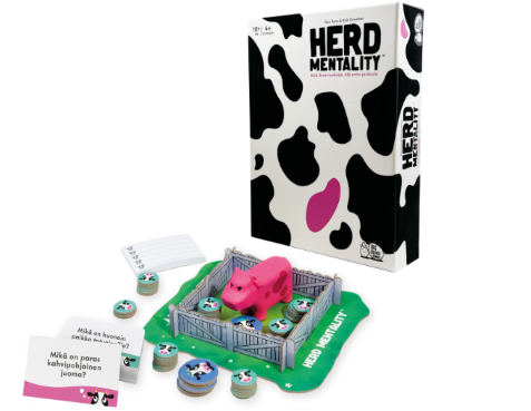 Hauska perhepeli, jonka tavoite on erittäin yksinkertainen: ajattele samalla tavalla kuin kaikki muut! Pelaajat vastaavat kysymyksiin, kuten ottaisitko mieluummin robottikädet vai robottijalat. Jos onnistut vastaamaan, kuten enemmistö, voitat lehmiä. Jos vastasit ainoana eri tavalla, saat pinkin lehmän ja laumasi on arvoton.. Muu. Nyt on aika kulkea lauman mukana! 4-20 pelaajalle. Suomenkielinen. 10+