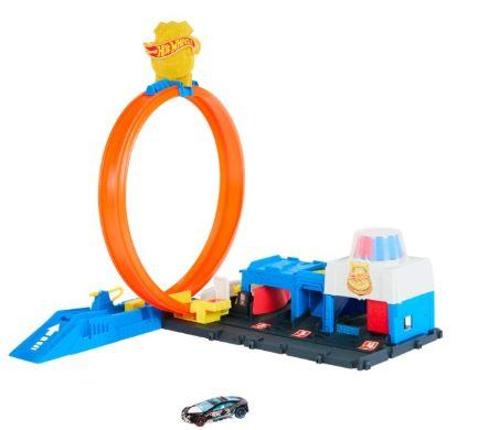 Hot Wheels -poliisiasemalla on huimaava silmukka, jota voit säätää sen mukaan, mille poliisiaseman kaistalle haluat laskeutua. Poliisiasemalla on myös hauskoja leikkitoimintoja. Sisältää yhden Hot Wheels -poliisiauton. 4+