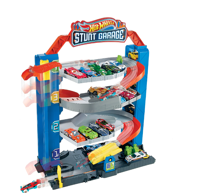 Tässä parkkitalossa ei tyydytä ajamaan rataa pitkin alas, vaan siirtyminen tasolta toiselle tapahtuu hyppäämällä. Parkkitalossa on tilaa 20 autolle. Yhdistettävissä muihin Hot Wheels City -osiin. Sisältää yhden auton. Ikäsuositus yli 4-vuotiaille.