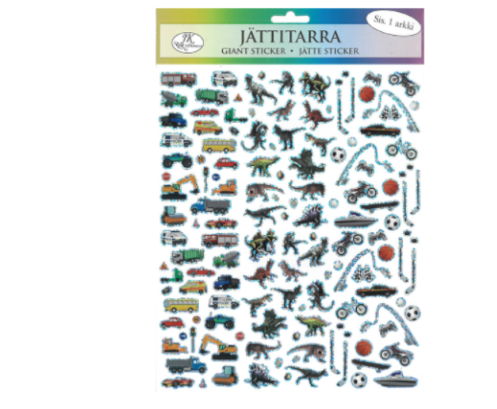 Jättitarra-arkki askarteluun ja koristeluun. Pakkaus sisältää yhden arkin erilaisia paperisia tarroja, joissa on hologrammipinta.