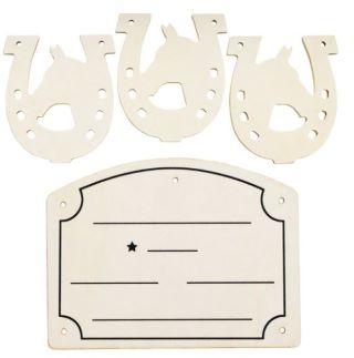 Tämän setin ansiosta talli saa aivan uuden ilmeen. Nimikyltti on aina hyvä olla – miten ystävät, vierailijat ja muut hevoset muuten tietäisivät keppihevosesi nimen? Kirjoita, maalaa tai polta kylttiin nimi, syntymävuosi ja muut tärkeät tiedot. Valmistettu vanerista. Koko 20 x 15 cm. Kolmen palkintolaatan koko on 8,7 × 10 cm, ja ne on valmistettu vanerista.