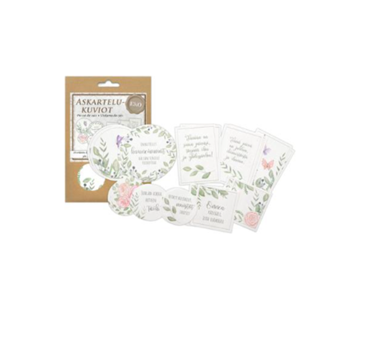 Eko Askartelukuvio askarteluun ja koristeluun. Pakkaus sisältää 20 kappaletta kartonkisia askartelukuvioita. Yhtä kuosia on 2 kappaletta per pakkaus. Tuotteen valmistuksessa on hyödynnetty mahdollisimman paljon kierrätettyjä materiaaleja. Tuotteessa ja pakkauksessa ei ole käytetty muovia.
