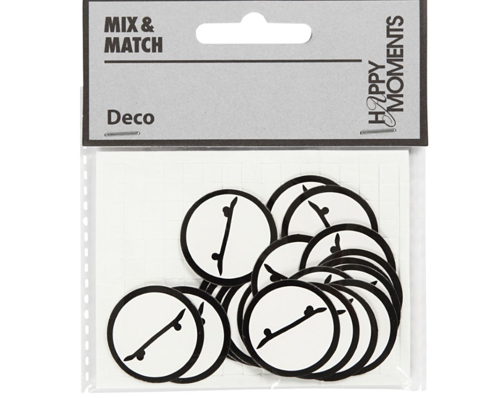 Pyöreä valkoinen kartonki, johon painettu musta kuva/symboli. Mukana 3D-tarratyynyt