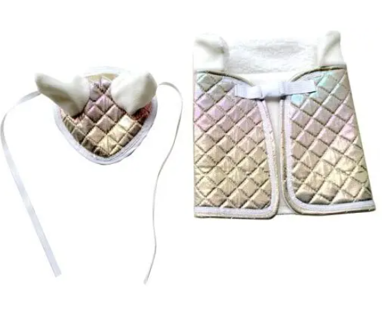 Upea kullanhohtoinen toppaloimi keppihevoselle! Loimessa karvakaulus ja säätövaraa edessä. Mukana myös nyörein solmittava korvahuppu. Ikäsuositus 3+ vuotta. Tuotteen mittatiedot: 35 x 24 x 2 cm – 0,04 kg