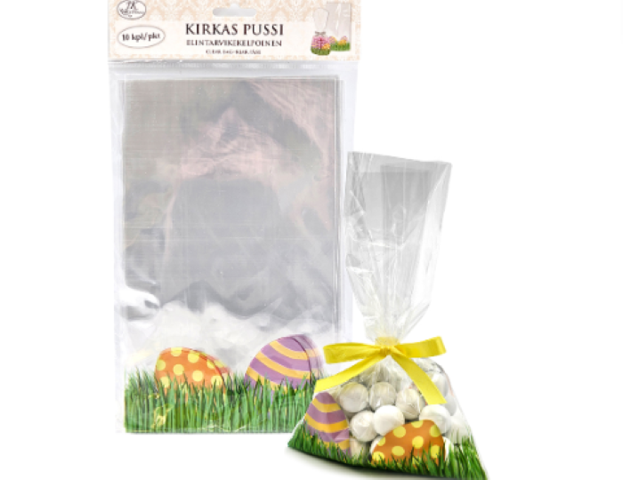 Kirkas pussi kuviolla paketointiin. Pakkaus sisältää 10 kappaletta kirkkaita ja muovisia pusseja, joissa on kuviointi. Pussit ovat elintarvikekelpoisia.