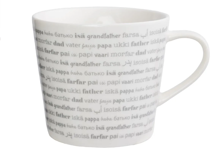 Kaunis valkoinen muki, jonka vetoisuus on 3,5 dl. Mukin kylkeen on kirjoitettu isää ja isoisää tarkoittavia sanoja Suomen puhutuimmilla kielillä. Isälle, isoisälle, puolisolle!