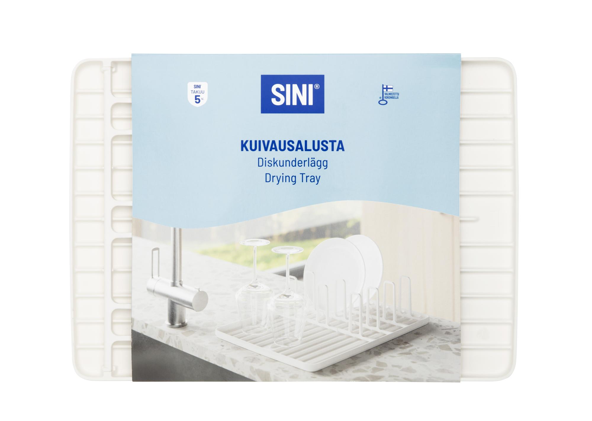 Viinilasit, termoskannut ja maljakot pysyvät pystyssä eikä vesi valu tiskipöydälle. Kuivausalustassa on kätevät piikkirivit, jotka saa tarpeen mukaan ylös tai alas. Piikkirivin saa käännettyä matalaksi säilytyksen ajaksi, jolloin kuivausalusta mahtuu pieneen tilaan. Sopii myös mökille, veneeseen ja asuntoautoon. Valumavesi ei valu tiskipöydälle vaan se kaadetaan pois alustasta käytön jälkeen. Kuivausalustan voi puhdistaa tarvittaessa vedellä ja astianpesuaineella. SINI aterinteline ja tiskipöydän järjestäjä sopivat kuivausalustan päälle muodostaen tuoteperheen, joka helpottaa keittiön puhtaanapitoa ja tiskausta.