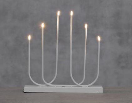 Kaunis ja moderni 6-haarainen kynttelikkö. Kynttilöissä on lämpimän valkoiset LED-lamput. Muuntaja IP20. Vain sisäkäyttöön.