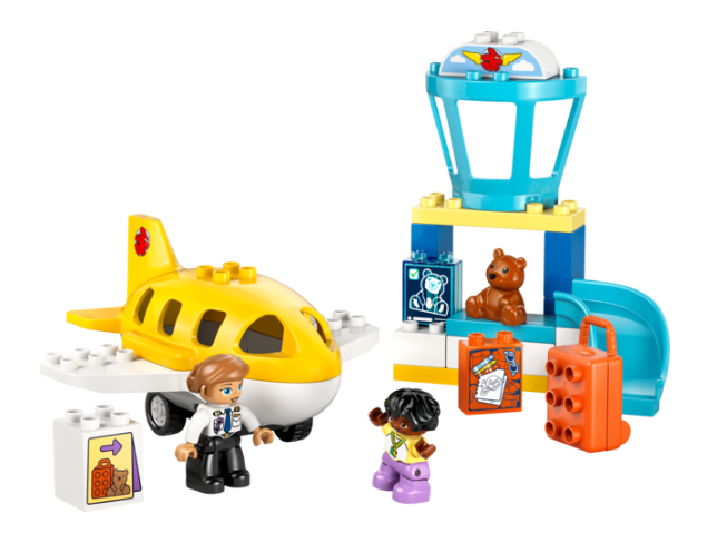 Tämä leikki-ikäisten lelu on täynnä oppimistehtäviä. Lelun mukana tulevan tunnepyörän avulla perheissä voidaan jutella tunteista, joita kiireinen lentokenttä tai lentomatka saattavat herättää. Taaperot voivat hioa hienomotorisia taitojaan, kun he pakkaavat saranoidun lelumatkalaukun ja asettelevat hahmot lentokoneeseen. Tämä loogista päättelykykyä kehittävä lelu saa leikkijänsä hyödyntämään luovuuttaan, kun he käyvät matkan läpi vaihe vaiheelta tullakseen oman LEGO DUPLO seikkailunsa sankareiksi. Sisältää 23 osaa.