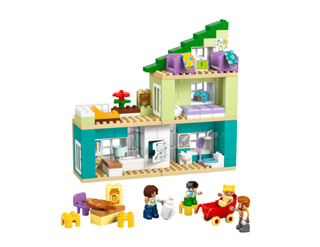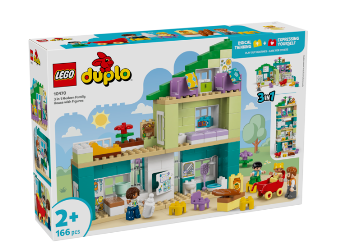 Nykyaikainen omakotitalo ja hahmot 3in1 ‑setistä (10470) yli 2-vuotiaat lapset rakentavat nukketalon, jonka parissa voi leikkiä perhearkea. Interaktiivisessa setissä on 4 hahmoa: 2 vanhempaa, pikkulapsi ja vauva. Nukketalon asukkaiden kanssa taaperot oppivat sosiaalisia taitoja ja tunneälyä leikin lomassa.