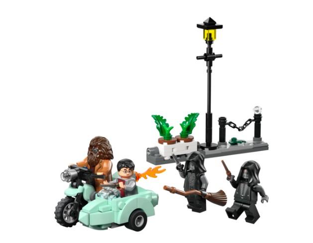 Aseta Rubeus Hagridin minihahmo moottoripyörän satulaan ja Harry Potter sivuvaunuun. Sijoita 2 kuolonsyöjiä esittävää minihahmoa lyhtypylvään valaisemalle Likusteritielle, jonka kukkaistutukset on tarkoitettu töytäistäväksi kumoon sankarien huiman paon aikana.