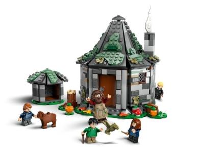 Tutun Harry Potter ‑tapahtumapaikan talo ja 5 LEGO minihahmoa – Harry Potter, Hermione Granger™, Ron Weasley™, Draco Malfoy™ ja Rubeus Hagrid sekä Norbert‑ ja Tora-hahmot.