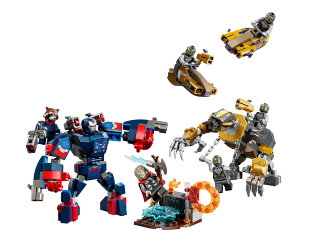 Setissä on 7 minihahmoa: Rautapatriootti MK2, Rocket ja suuri nuppipyssy, Thor ja Stormbreaker sekä 4 Chitauria, joista 2:lla on kultaiset nuppipyssyt. Mukana on 2 suurta rakennettavaa LEGO® hahmoa, jotka on nivelletty dynaamisia leikkejä varten, Rautapatriootti-robotti 4 nuppipyssyllä sekä pelottava Chitauri-gorilla.Setti sisältää myös 2 suihkuskootteria sekä pienen säilytyspaikan Thor-minihahmon vara-ammuksille. 8+.