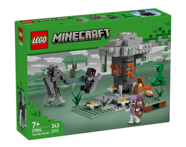 7 vuotta täyttäneille pojille ja tytöille suunnatun LEGO® Kalpea puutarha (21586) rakennuslelun parissa pelaajat pääsevät tutustumaan Minecraft®-pelin kummallisiin ja ihmeellisiin biomeihin. Palikoista rakennettava Creaking-hahmo saa vastaansa urhean Mothmanin, ja puutarhabiomin ympärillä vaanivat Creeper™ ja luuranko.