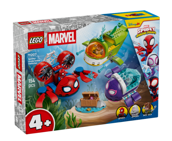 Spidey ja vedenalaiset menopelit ‑leikkisetin (11207) parissa yli 4-vuotiaat pojat, tytöt ja LEGO® ǀ Marvel fanit voivat suunnata mielikuvitusseikkailuihin. Luovuutta kehittävä rakennussetti sisältää Spideyn, Ghost-Spiderin ja tohtori Mustekalan minihahmot sekä 3 sukellusvenettä.