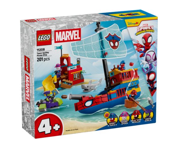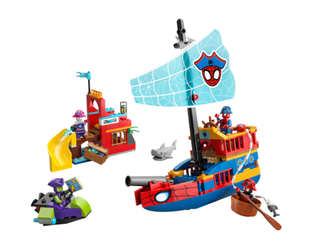 Spideyn tiimin merirosvolaiva ‑rakennussetti (11208) houkuttelee mielikuvitusleikkeihin Spideyn, Vihreän Menninkäisen, Ghost-Spiderin ja Miles ”Spin” Moralesin seurassa. Rakennussetin parissa 4 vuotta täyttäneet pojat ja tytöt voivat kehittää taitojaan pitäen samalla hauskaa merillä ja Spider Islandin saarella.