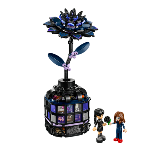 Setti sisältää LEGO® version mustasta daaliasta, jolla voi lukita maljakon, jonka sisällä on leikkitilaa, liikuteltavia huonekaluja ja minikokoinen viherhuone ikkunoineen. Lapset uppoutuvat seikkailuihin sekä mielikuvitus‑ ja roolileikkeihin sarjan ensimmäiseltä kaudelta tuttujen Wednesday Addamsin ja professori Marilyn Thornhillin mininukkehahmojen kanssa. 9+.