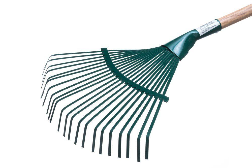 Metallipiikkinen lehtiharava valmiiksi kiinnitetyllä puuvarrella.