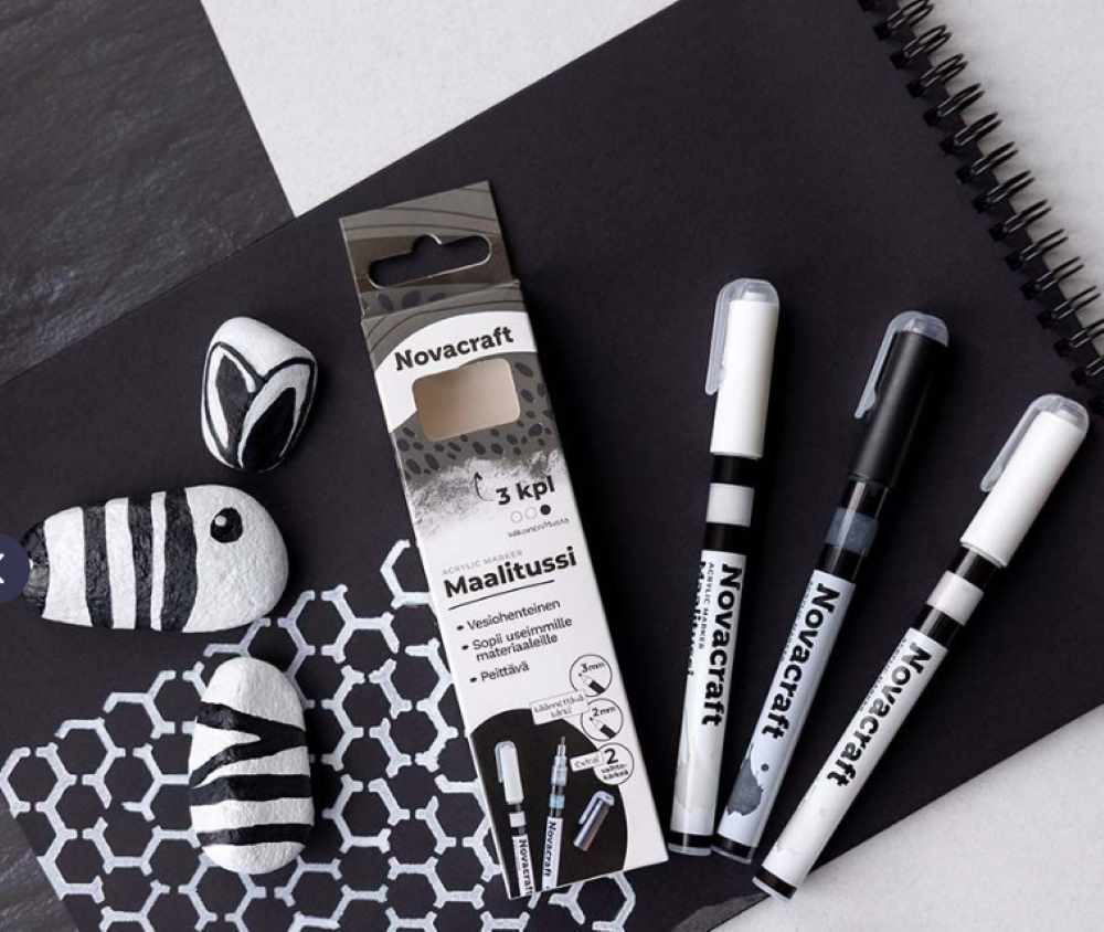 Novacraft akryylipohjainen vesiohenteinen maalitussi – Acrylic Marker. Maalitussit sopivat useimmille materiaaleille mm. paperille, pahville, maalauspohjille, puulle, tekstiileille, kivelle, useimmille muoveille, metallille, lasille ja keramiikalle.