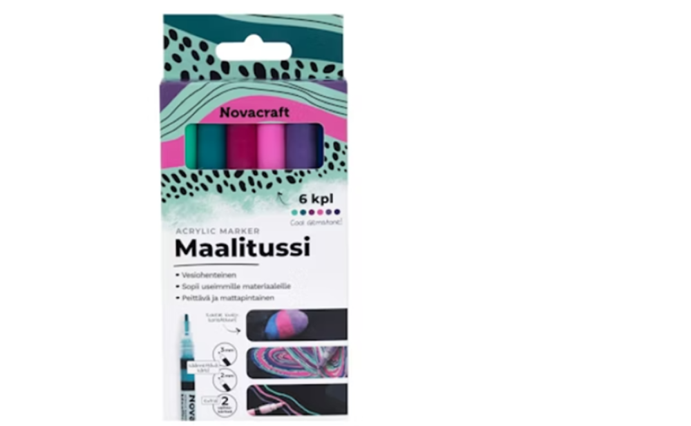 Novacraft akryylipohjainen vesiohenteinen maalitussi – Acrylic Marker. Maalitussit sopivat useimmille materiaaleille mm. paperille, pahville, maalauspohjille, puulle, tekstiileille, kivelle, useimmille muoveille, metallille, lasille ja keramiikalle. Piirtojälki on peittävä ja mattapintainen. Se kuivuu nopeasti ja on kuivuttuaan kestävää huokoisilla pinnoilla. Ei-huokoisilla pinnoilla kiinnitä maali materiaalille sopivalla viimeistelylakalla tai vernissalla. Kankaassa väri pysyy paremmin lämpökiinnityksen jälkeen. Cool Gemstone -värilajitelma sisältää kuusi eri väristä kynää: Vihreä jade, vihreä smaragdi, punainen rubiini, pinkki timantti, violetti ametisti, sininen safiiri. Vinkki! Kokeile kyniä kivien koristeluun.