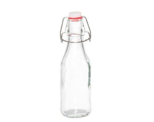 Kirkas lasipullo esimerkiksi kotitekoisen mehun säilöntään. Patenttikorkki. Vetoisuus 250 ml. Käsinpesu.